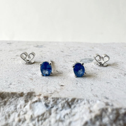 14K Solid Gold Genuine Ceylon Sapphire Oval Studs/Pair