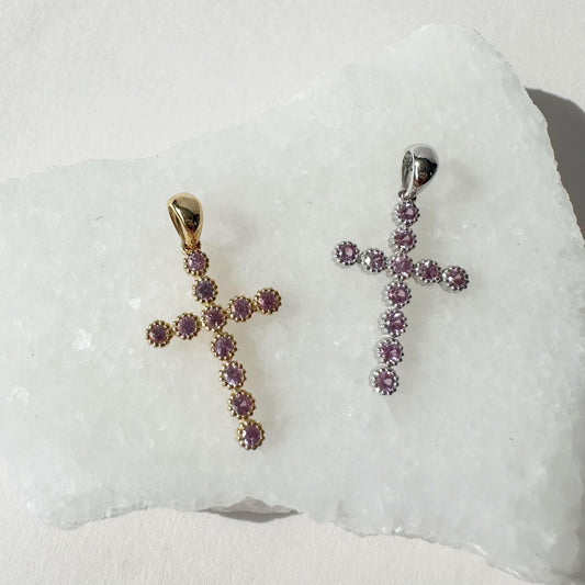 14K Solid Gold Genuine Pink Sapphire Cross Pendant (pendant only)