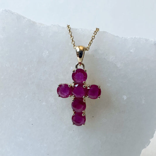 14K Solid Gold Genuine Round Ruby Cross Pendant