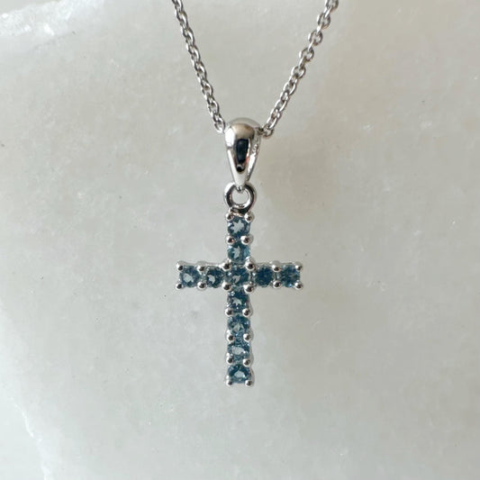 14K Solid Gold Genuine Blue Topaz Cross Pendant