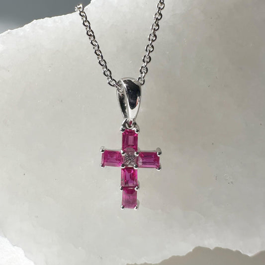 14K Solid White Gold Genuine Baguette Ruby and Diamond Cross Pendant