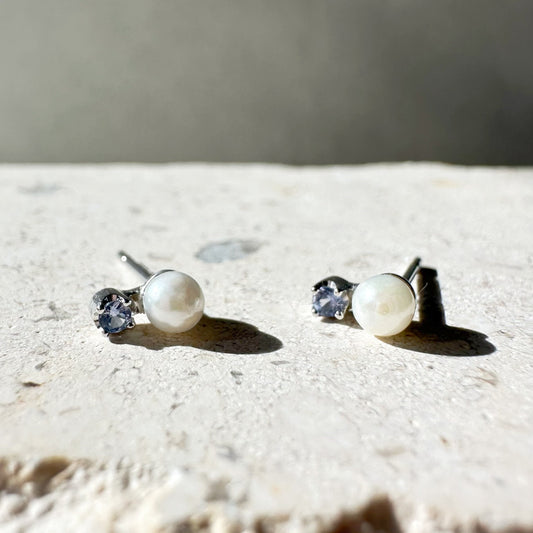 14K Solid Gold Genuine 3.5mm Mini Akoya Pearl and Ceylon Sapphire Studs/Pair
