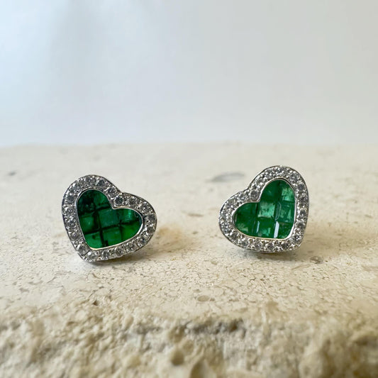 14K Solid Gold Genuine Emerald and Diamond Heart Studs/Pair