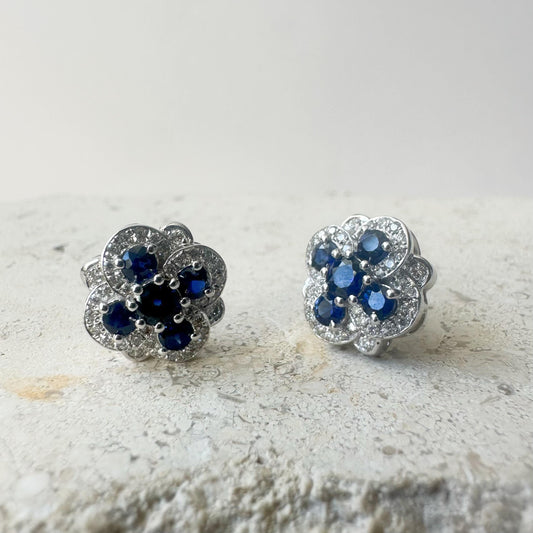 14K Solid White Gold Genuine 1.94 CT Sapphire and Diamond Flower Studs/Pair