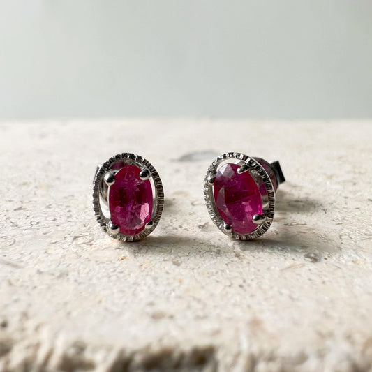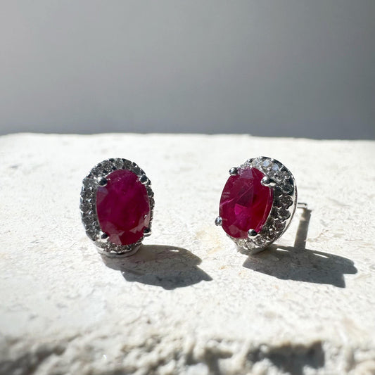 14K Solid White Gold Ruby and Diamond Halo Studs