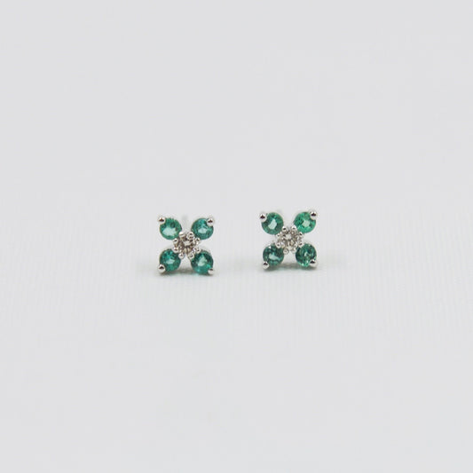 14K Solid Gold Genuine Emerald and Diamond Flower Studs