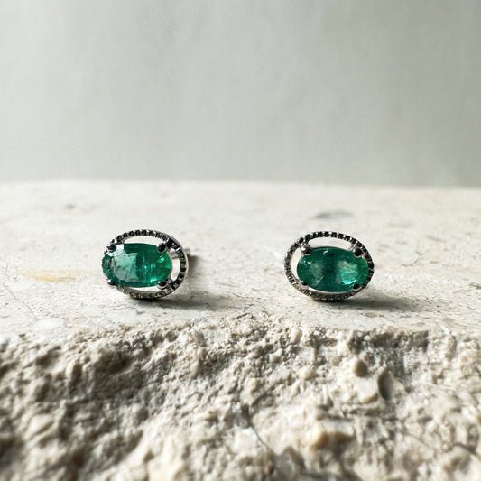 14K Solid Gold Genuine Emerald and Diamond Stacked Studs/Pair
