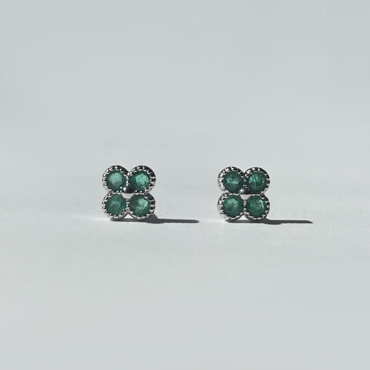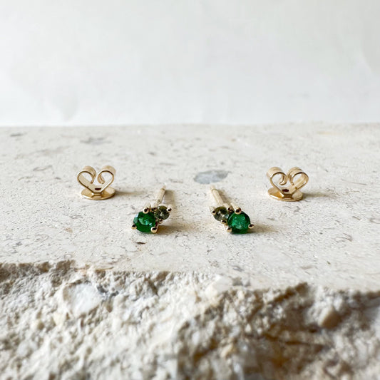 14K Solid Gold Genuine Emerald and Green Sapphire Stacked Studs/Pair