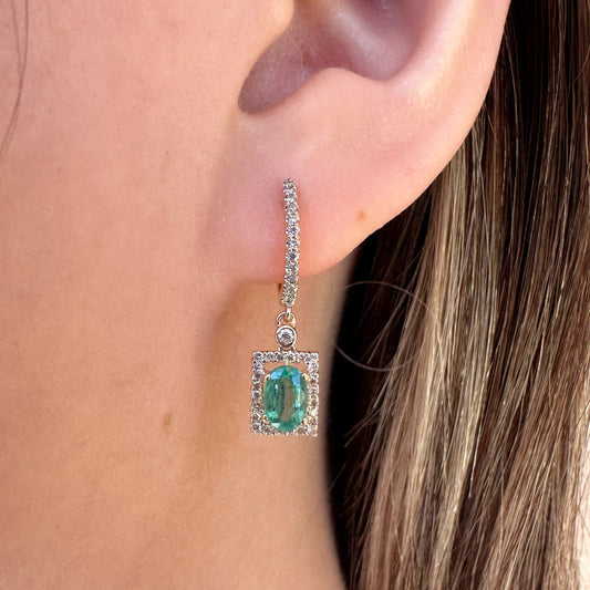 14K Solid Gold Genuine Diamond and Emerald Square Dangle Earrings/Pair