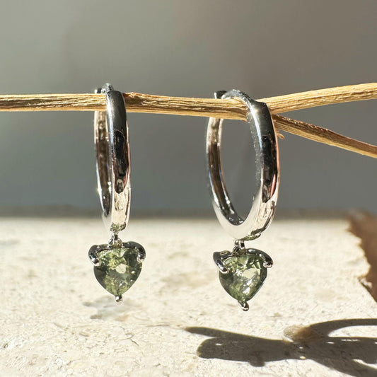 14K Solid Gold Genuine Green Sapphire Heart Huggies/Hoops/Pair
