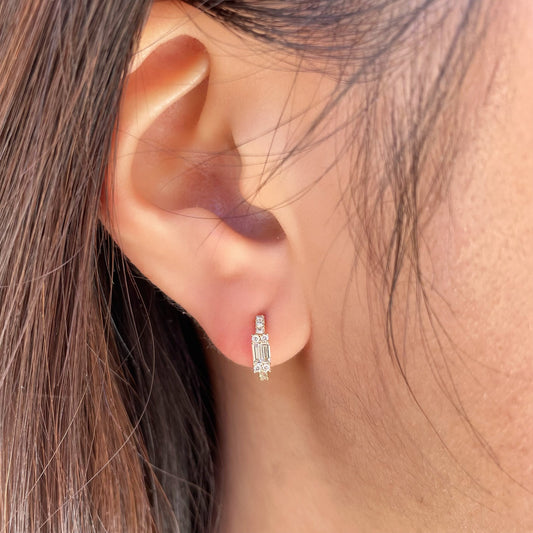 14K Solid Gold Genuine Diamond Baguette Half Hoop Earrings/Pair