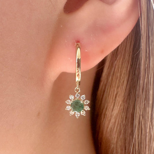 14K Solid Gold Genuine Dangle Diamond and Emerald Sun Hoops