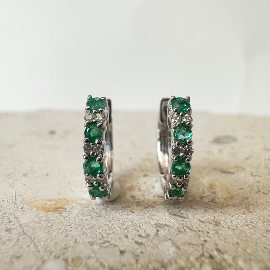 18K Solid White Gold Genuine Emerald and Diamond Hoops