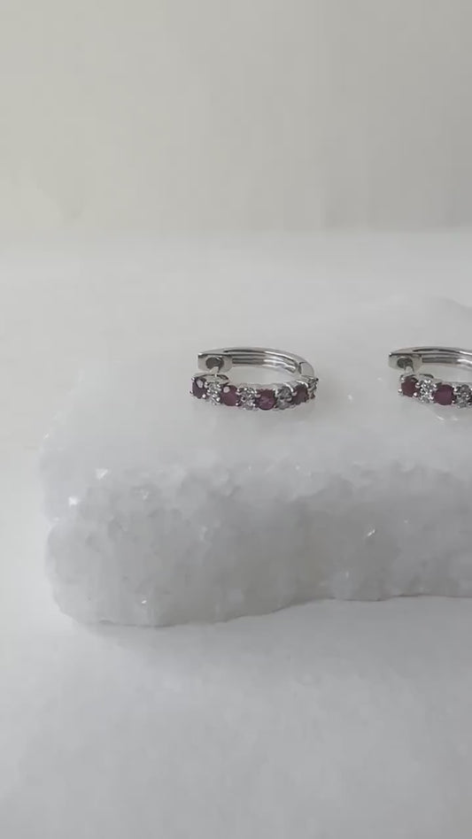18K Solid Gold Genuine Ruby and Diamond Hoops/Pair