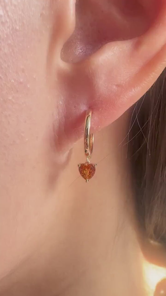 14K Solid Gold Genuine Orange Sapphire Heart Huggies/Hoops/Pair