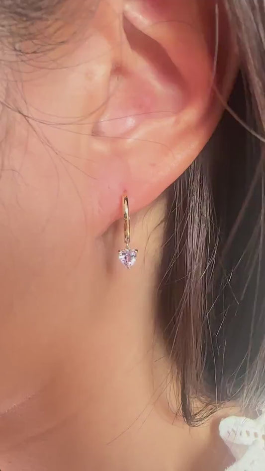 14K Solid Gold Genuine Lavender/Purple Sapphire Heart Huggies/Hoops/Pair
