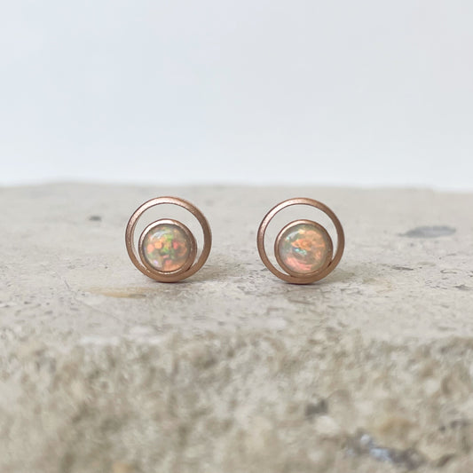 14K Solid Gold Genuine Opal Double Circle Studs/Satin Finish/Pair