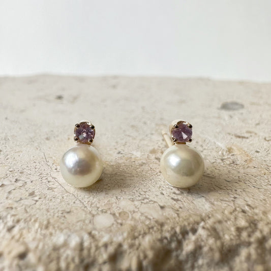 14K Solid Gold Genuine Akoya Pearl and Pink Sapphire Studs/Pair