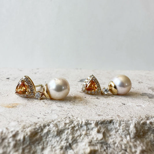 14K Solid Gold Genuine Pearl, Orange Sapphire and Diamond Fancy Dangle Earrings/Pair