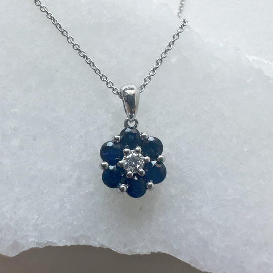14K Solid Gold Genuine Sapphire and Diamond Flower Pendant