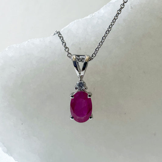 14K Solid White Gold Genuine Oval Ruby and Diamond Pendant