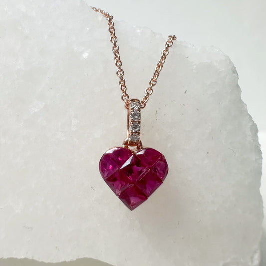 14K Solid Gold Genuine Diamond and Ruby Heart Pendant