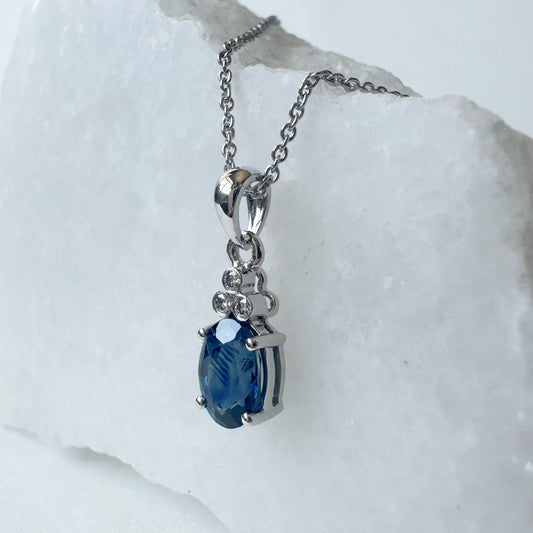 14K Solid White Gold Genuine Sapphire and Trio Diamond Pendant