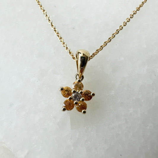 14K Solid Gold Genuine Orange Sapphire and Diamond Flower Pendant