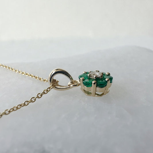 14K Solid Gold Genuine Emerald and Diamond Flower Pendant