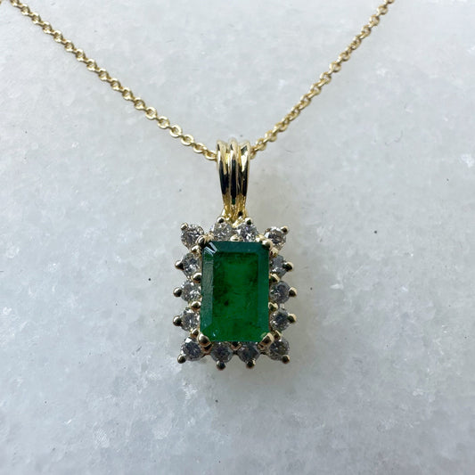 14K Solid Gold Genuine Emerald and Diamond Emerald Cut Pendant