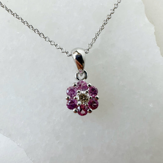 14K Solid Gold Genuine Pink Sapphire and Diamond Flower Pendant