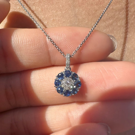 14K Solid White Gold Genuine Sapphire Cluster and Diamond Pendant