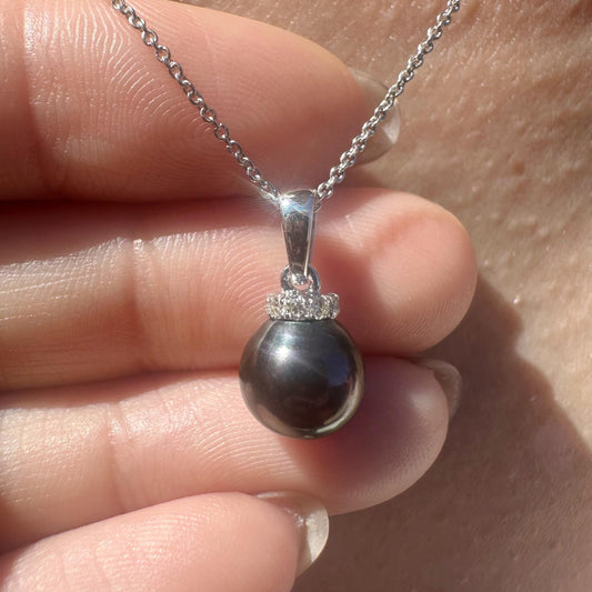 14K Solid Gold Genuine Diamond and Black Pearl Pendant