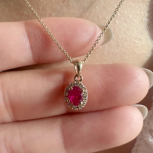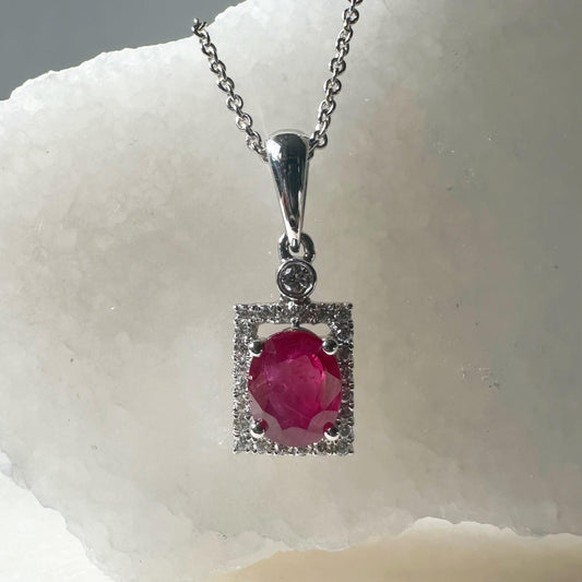 14K Solid Gold Genuine Oval Ruby and Diamond Square Pendant