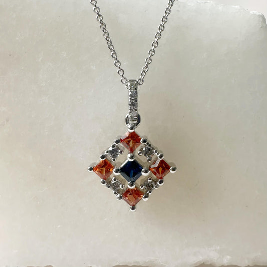 14K Solid Gold Genuine Color Sapphire and Diamond Tetris Pendant