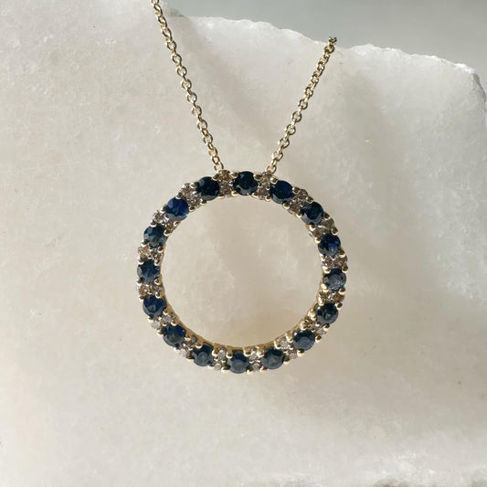 14K Solid Gold Genuine Sapphire and Diamond Circle Pendant