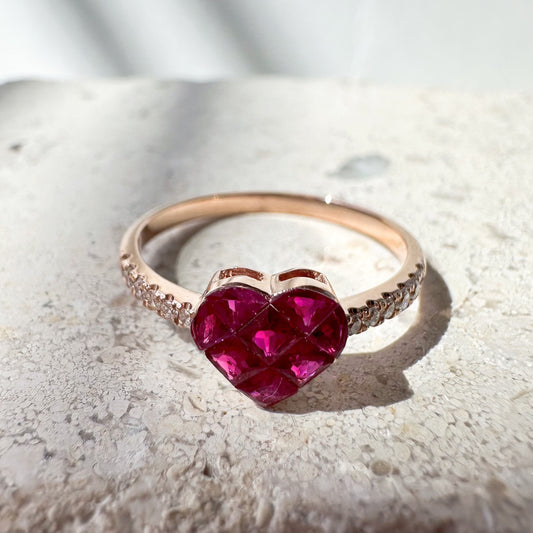 14K Solid Rose Gold Genuine Ruby and Diamond Invisible Setting Heart Ring