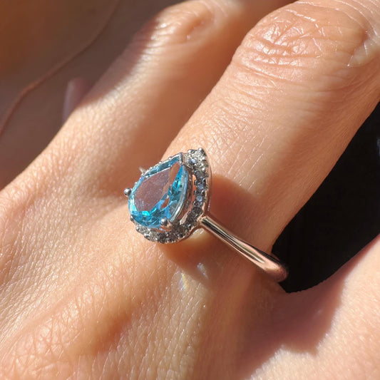 14K Solid Gold Genuine Blue Topaz and Diamond Teardrop Ring/Engagement Ring/Promise Ring