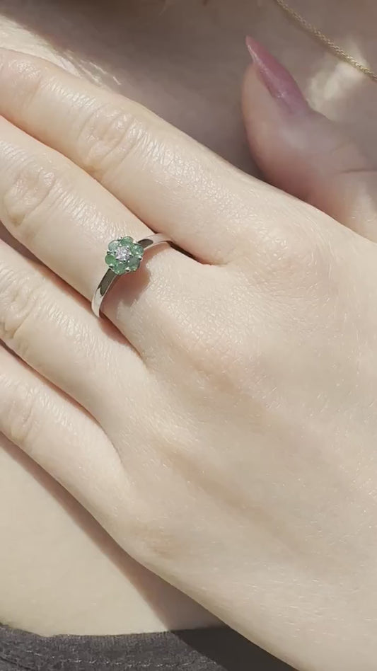 14K Solid White Gold Genuine Emerald and Diamond Flower Ring