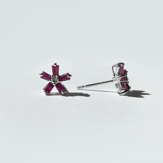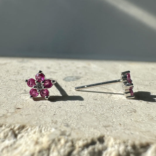 14K Solid Gold Genuine Ruby and Diamond Flower Studs