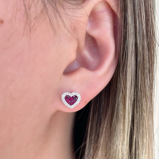 14K Solid Gold Genuine Ruby and Diamond Heart Studs/Pair