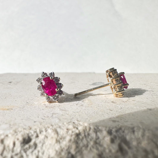 14K Solid Gold Genuine Ruby and Diamond Halo Studs/Pair