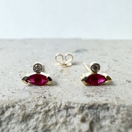 14K Solid Gold Genuine Marquise Ruby and Diamond Stacked Studs/Pair