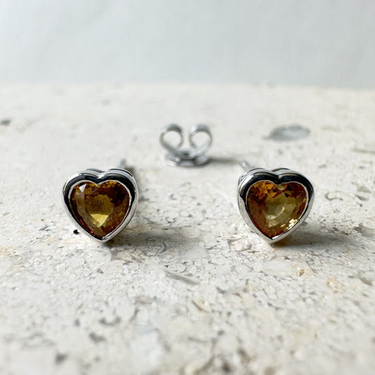 14K Solid White Gold Genuine Yellow Sapphire Bezel Heart Studs/Pair